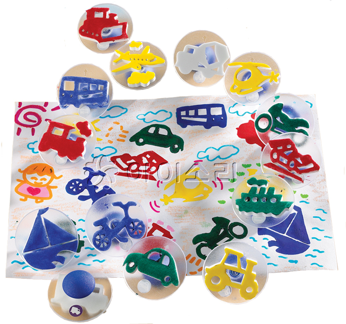 손잡이가 달려있는 스탬프로 14가지의 교통수단의 다양한 모양과 모습을 찍기놀이가 가능합니다.