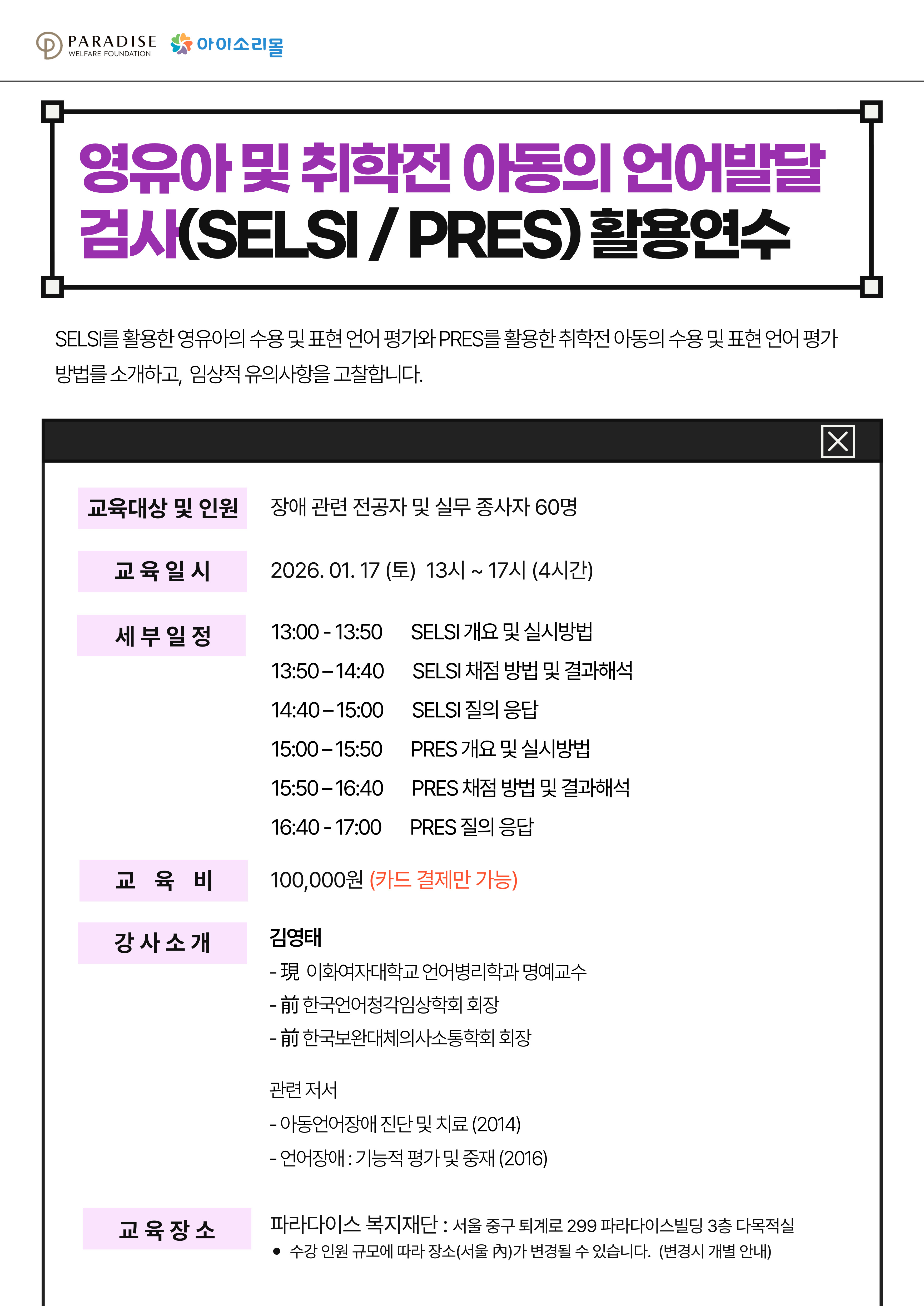 영유아 및 취학전 아동의 언어발달 검사(SELSI / PRES) 활용연수